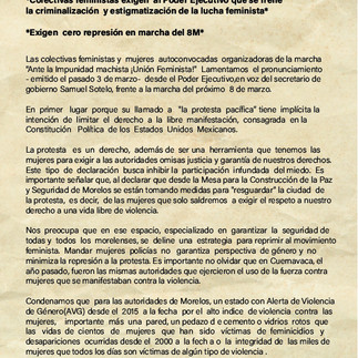 Es importante señalar que, al declarar que desde la Mesa para la Construcción de la Paz y Seguridad de Morelos se están tomando medidas para "resguardar" la ciudad de la protesta, es decir, de las mujeres que solo saldremos a exigir el respeto a nuestro derecho a una vida libre de violencia.