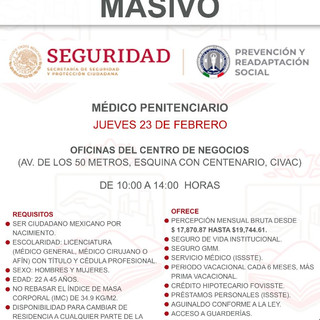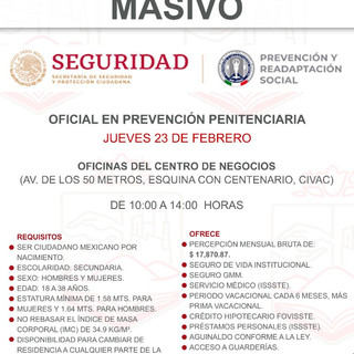 Centro de Negocios de la Secretaría de Desarrollo Económico, instalación ubicado en el Parque Venus de la colonia Civac. Este jueves 23 de febrero de las 10:00 a las 14:00 horas se estarán reclutando Oficiales en Prevención y Médicos Penitenciarios.